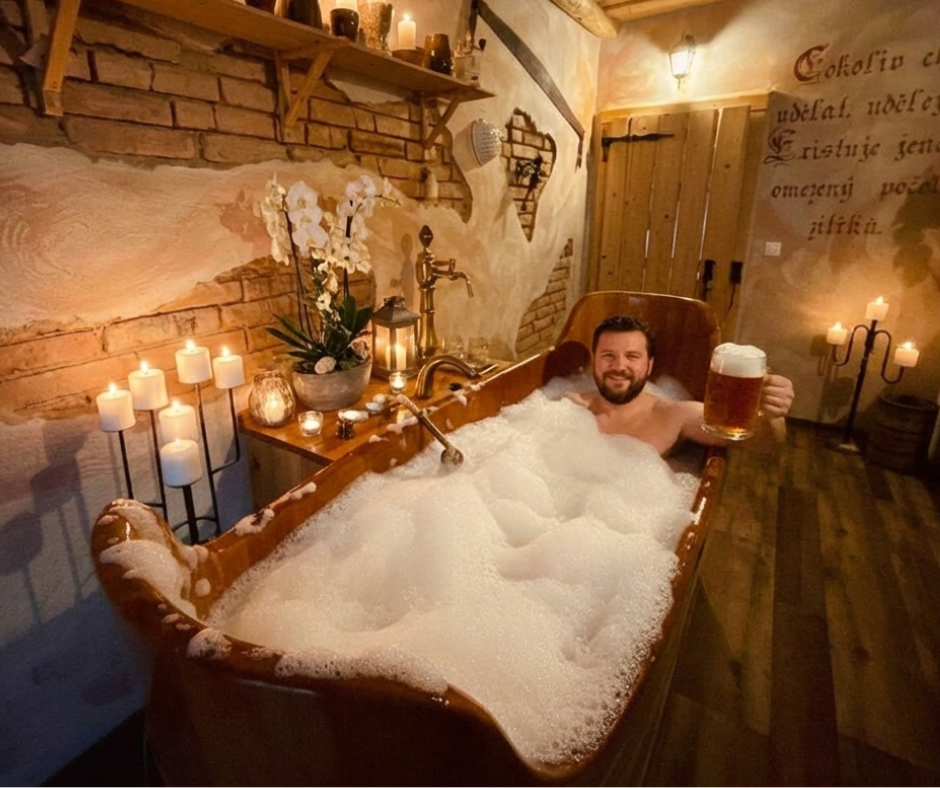Užijte si originální pivní koupel s neomezenou konzumací piva po dobu procedury. Relax, teplo, masážní perlička, voňavé chmelové extrakty a soukromí jen pro vás dva.